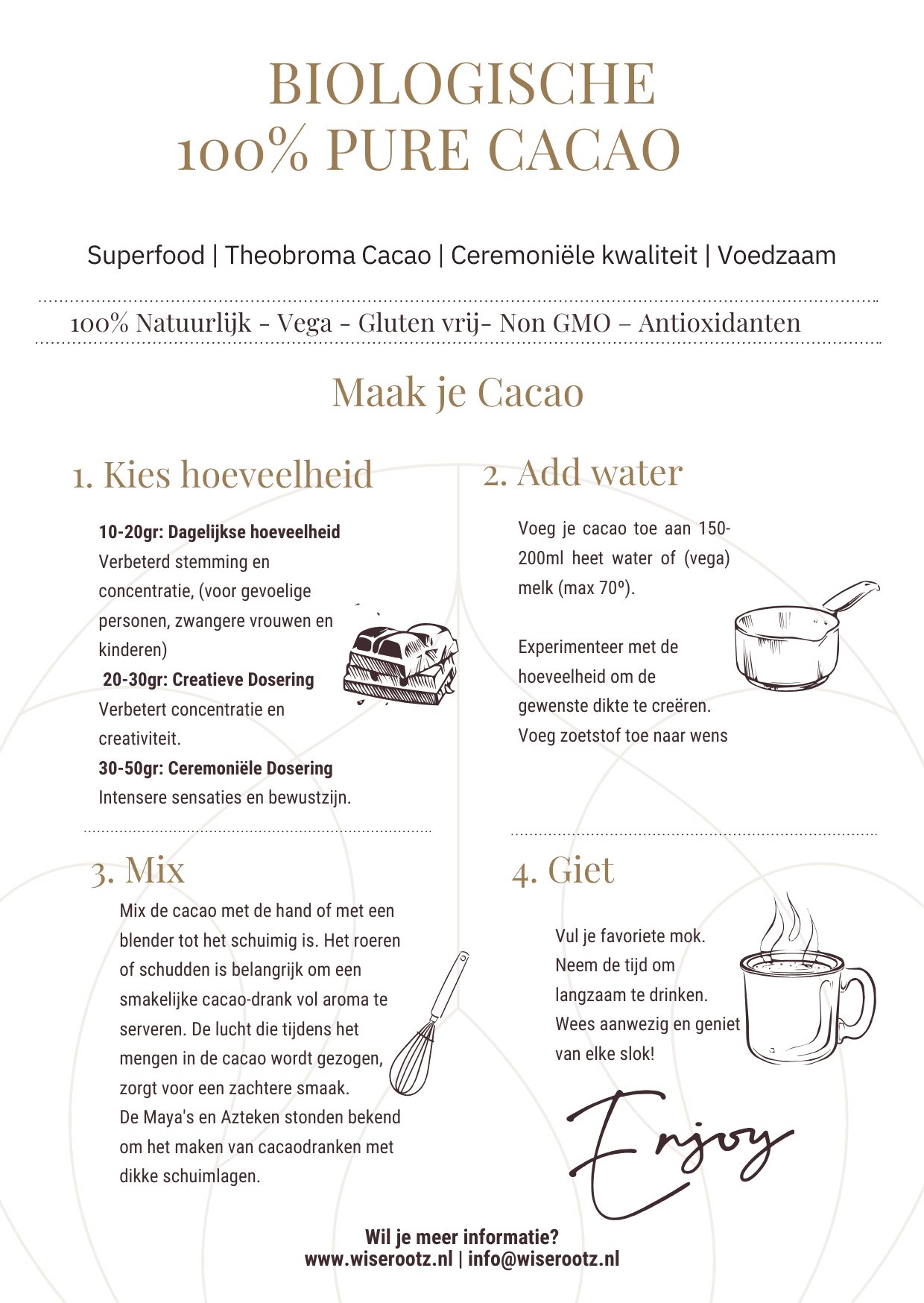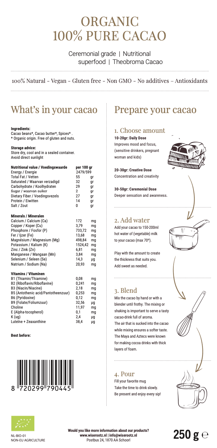Ervaar de essentie van échte cacao met de 100% pure ceremoniële cacao van Wise Rootz – met zorg in huis verwerkt voor maximale versheid, zuiverheid en smaak.